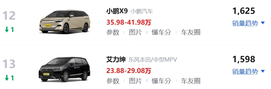 小鵬X9銷售1625輛,是3月份以來的月銷量新低,只是比本田艾力紳(1598輛)好了一點而已,在目前市場環境下,純電MPV的上限比較低,消費者會隨著逐漸理性的思考,轉而去選擇混動MPV或者純燃油MPV。