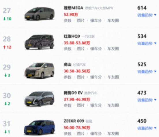 理想MEGA銷售614輛,是上市以來月銷量新低,4月份好歹還有1145輛的表現,看看極氪009的表現也不怎么樣,5月份銷售450輛,算上小鵬X9的話,幾乎所有純電MPV都排在細分市場底部了,當然魏牌高山也只銷售了525輛,而騰勢D9 EV銷售473輛,是否可以說明一些問題。
