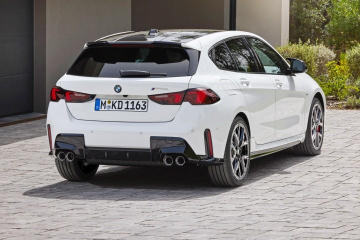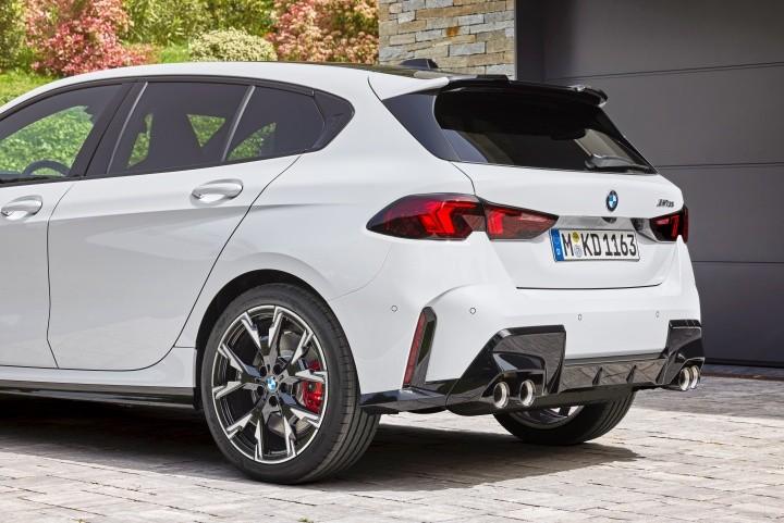 車尾部分,大改款 1 Series 后擋下方維持類似小鴨尾的車身線條,下方換上與新世代 X2 相近設計語匯的立體 LED 尾燈組,車色涂裝提供除了基本金屬漆、BMW Individual 烤漆與客制化選擇外,另外可首度選擇對比色車漆涂裝,外觀除了標準 Base 風格之外,也提供強調運動化氛圍的 M Sport 套件,至于 M135 xDrive 則擁有專屬的 M 水箱罩、19 吋鍛造雙色鋁圈及雙邊雙出排氣尾管配置。
