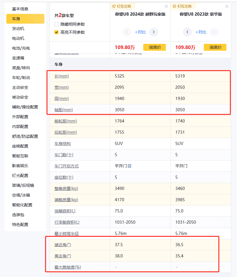 接著我們來看到U8越野玩家版車身尺寸的變動,U8越野玩家版長5325mm、寬2095mm、高1940mm,和豪華版(長寬高:5319*2050*1930mm)相比,車身整體大了一圈,軸距還是3050mm。由于尺寸的變化,U8越野玩家版車身的離去角為38°,接近角為37.5°,縱向通過角為26.5°,同樣比豪華版(車身接近角36.5°,縱向通過角25.5°,離去角35.4°)擴大了不少,由此進一步提高U8越野玩家版的越野性能。
