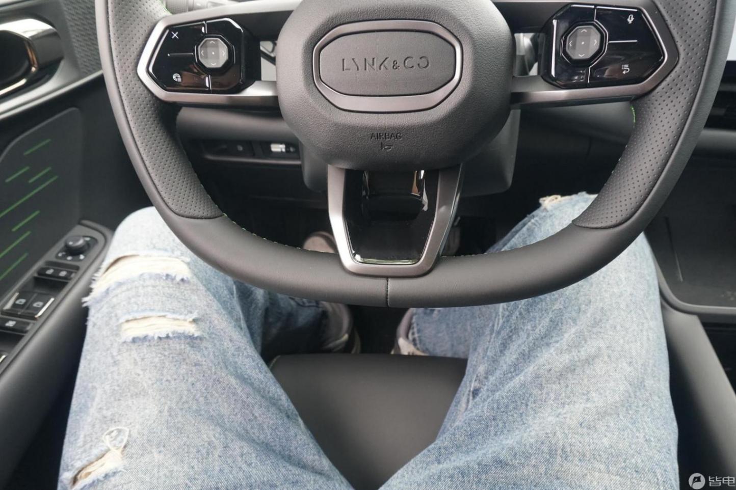 但由于車身寬度只有1820mm(比亞迪元plus 1875mm,沃爾沃EX30 1838mm),領克06EM-P的橫向空間不太理想,我的身高179cm,坐在駕駛位上,兩個膝蓋都被頂到兩側,雖然接觸位置坐了軟質材料包覆,但是因為材料較薄,所以長時間頂著膝蓋還是不太舒服的,如果接觸位置的軟包能夠更軟一點就更好了。