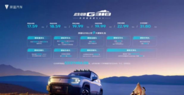 目前,G318已正式上市,價格區間為17.59萬元至22.99萬元。最貴的無憂穿越版售價高達31.8萬元,但仍在開發中。總的來說,G318的競爭力非常強,特別是在新能源越野車市場中,它是一款頗具創新性的新能源越野車,具有引人注目的市場定位。