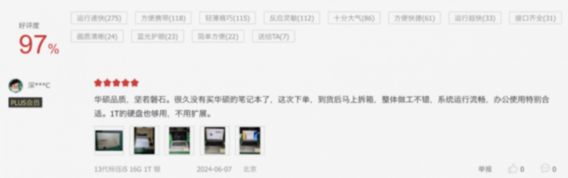 作為行業一線品牌,華碩筆記本的做工還是無需擔心的,很多已購用戶評價稱,這款輕薄本的整體做工很不錯,加上有97%的用戶好評度,整體口碑還是相當不錯的。
