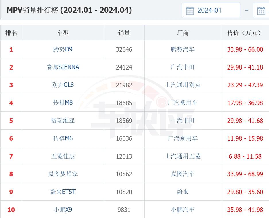 今年1~4月的銷量,騰勢D9仍然穩居MPV銷量榜第1名,賣出了3.3萬輛車。