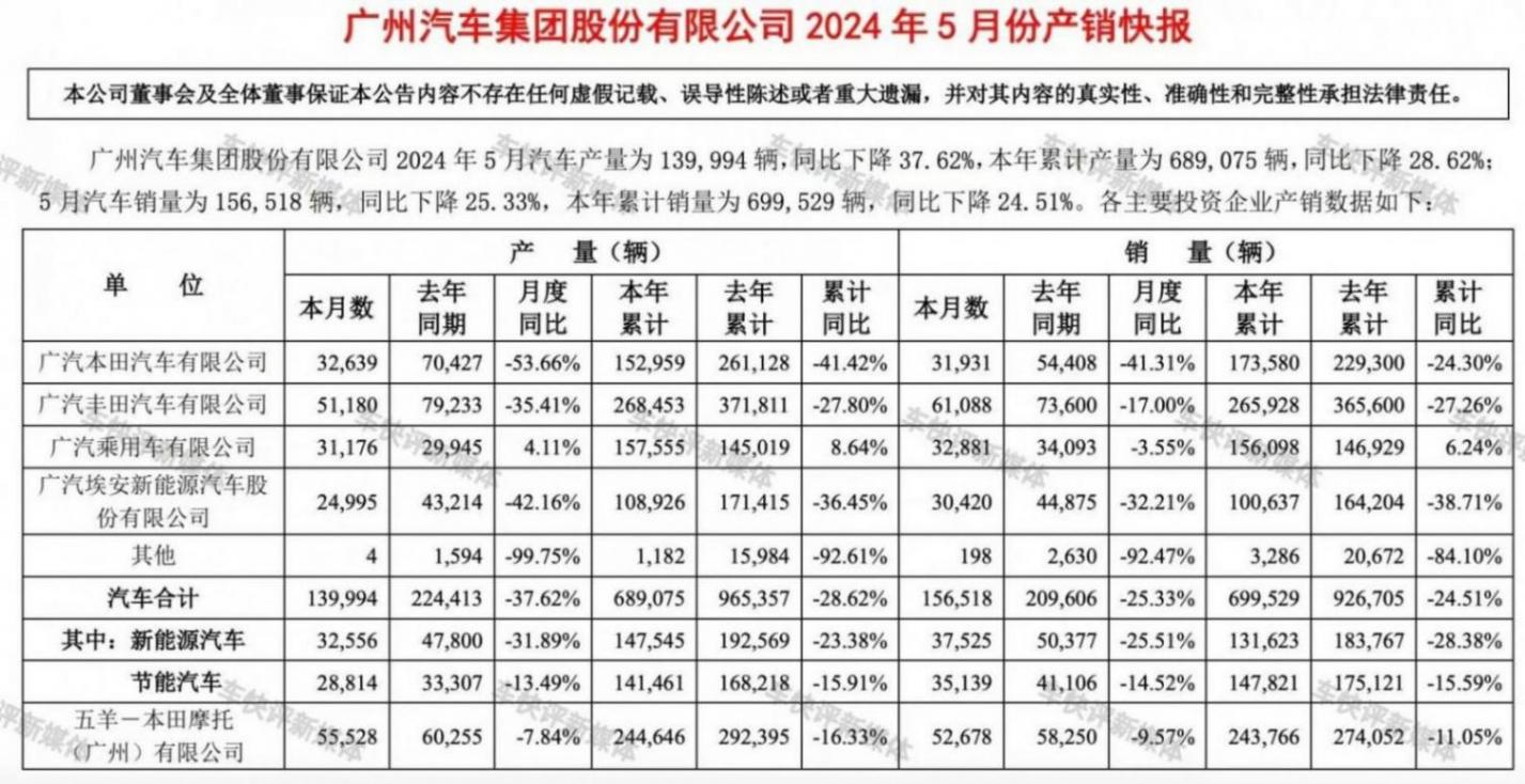 看到廣汽集團5月的銷量數據,你可能會明白作為廣汽集團的董事長,曾慶洪為何會2024中國汽車重慶論壇上痛批車市價格戰了。