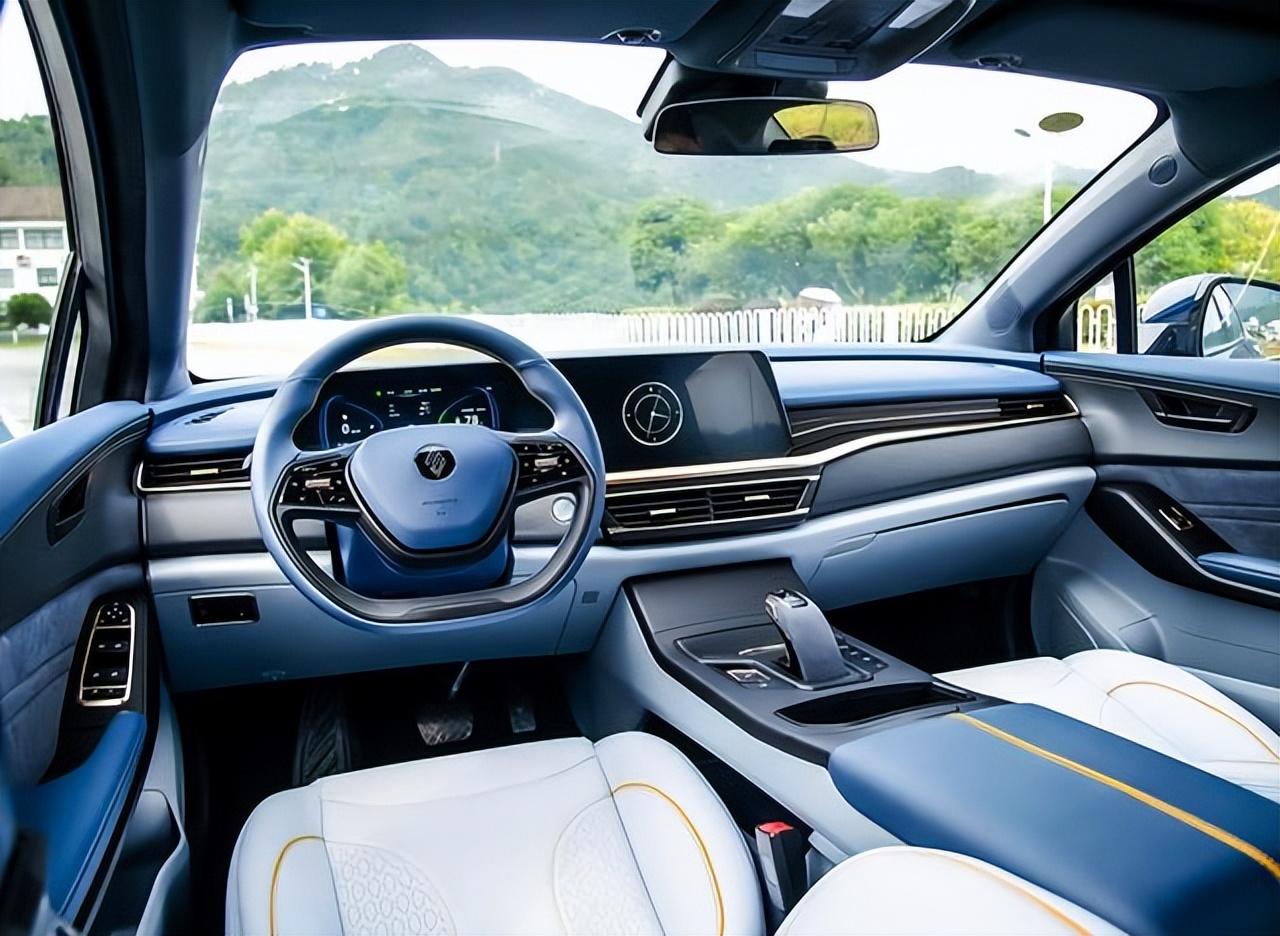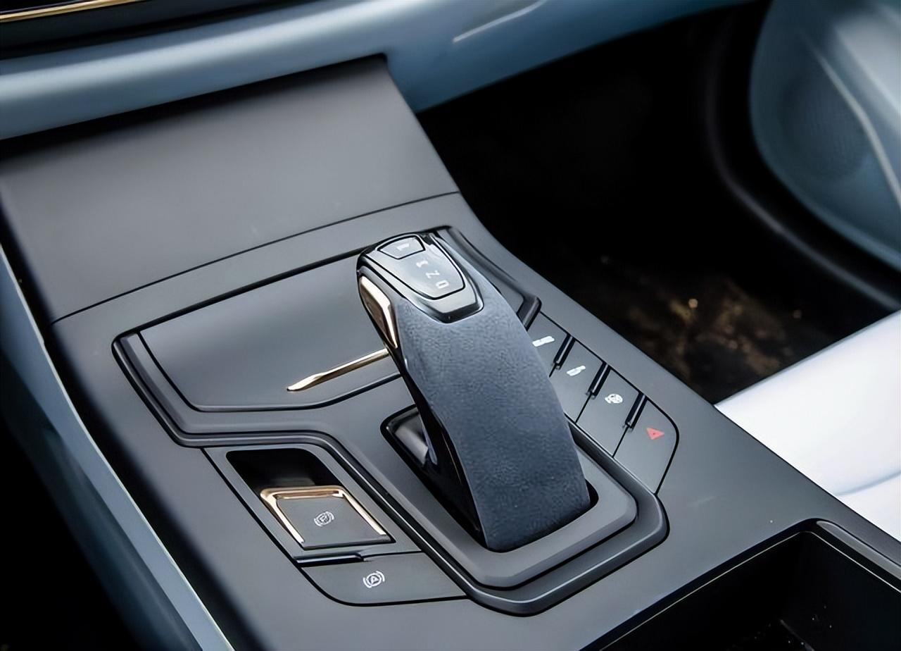 內飾采用了淺灰色的翻毛皮、靛藍色的真皮材質,還有星星點點的銀色金屬、金色元素裝點,這些細節的質感非常不錯,足見廠家的用心。環抱式的中控臺布局十分簡潔凝練,平底式的雙輻式方向盤采用靛藍色真皮和金色手工縫線設計,流暢的貫穿式空調出風口拉伸了車內的橫向視覺效果。10.1英寸的懸浮式液晶儀表與10.25英寸的懸浮式中控彩色觸摸大屏融為一體,依舊搭載iFLYTEK娛樂生態、語音控制以及手勢控制功能(手勢控制可控制系統界面和音樂播放等),UI界面的設計比較簡單,雖然沒有絢麗的動畫效果和高端芯片,但是在顯示清晰度和操作流暢度上都還是不錯的。類似飛機換擋手柄也帶來了更好的操控體驗。