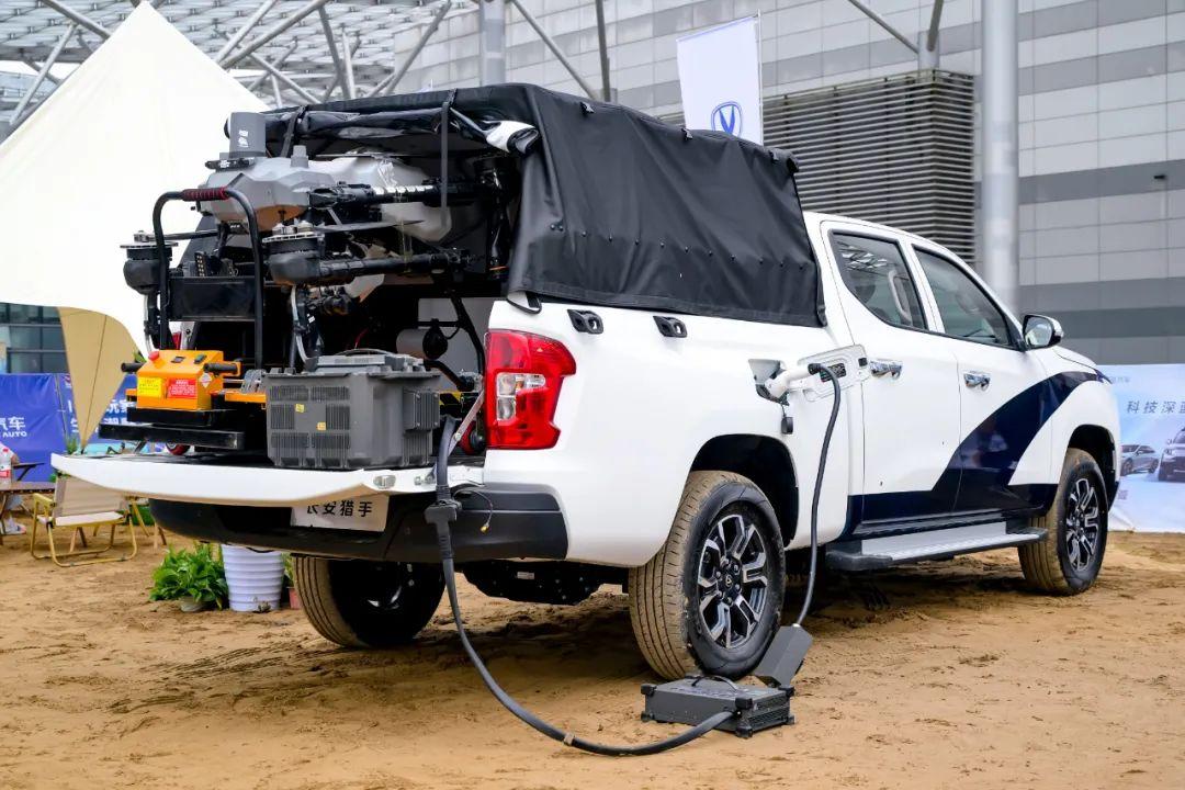 傳統的皮卡車,如何滿足戶外發電的需求?需要額外準備一臺柴油發電機(但是功率低、噪音大、污染大)。純電乘用車目前行業里最大能支持6.6kW外放電,滿足不了某些生產需求。而長安獵手則將外放電功率,一舉提升至22kW。這是什么概念?一個戶外電燒烤爐,在1.5kW-2.5kW之間,一臺長安獵手可以同時支持10臺電燒烤爐同時工作。除了滿足生活需求,也能契合各種生產場景。如果是魚塘養殖戶,停電了魚缺氧要死了怎么辦?如果是戶外工程檢修或者搶險救災作業,設備沒電干不了活特別是通訊設備、無人機沒電了怎么辦?一臺長安獵手就全部解決。