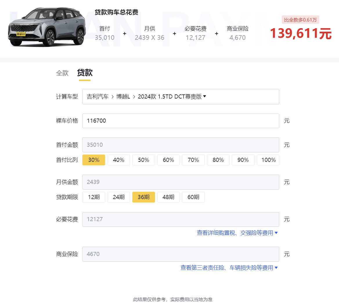 價格方面,車子的指導價為12.57萬,據小編所在地福州,終端顯示優惠9000元,優惠后裸車價格為116700元,必要花費12127元(其中購置稅10327元,車船稅350元,交強險950元,上牌費500元),商業保險4670元(其中第三方責任險按100萬元的賠付計算,費用為1917元、車輛損失險2033元,車上人員責任險(乘客)、車上人員責任險(司機)、車身劃痕險總合約720元,賠付額度可以根據自己的需求選擇),考慮到部分消費者想分期付款,這里也給出貸款的明細,以首付比例30%為例子,首付金額35010元,分36期,月供金額2439元,貸款購車總花費139611元,比全款多比全款多0.61萬。對于一臺家用緊湊型SUV來說,該車的售價不高,對于家庭工薪家庭的用戶來說不會有太大壓力。