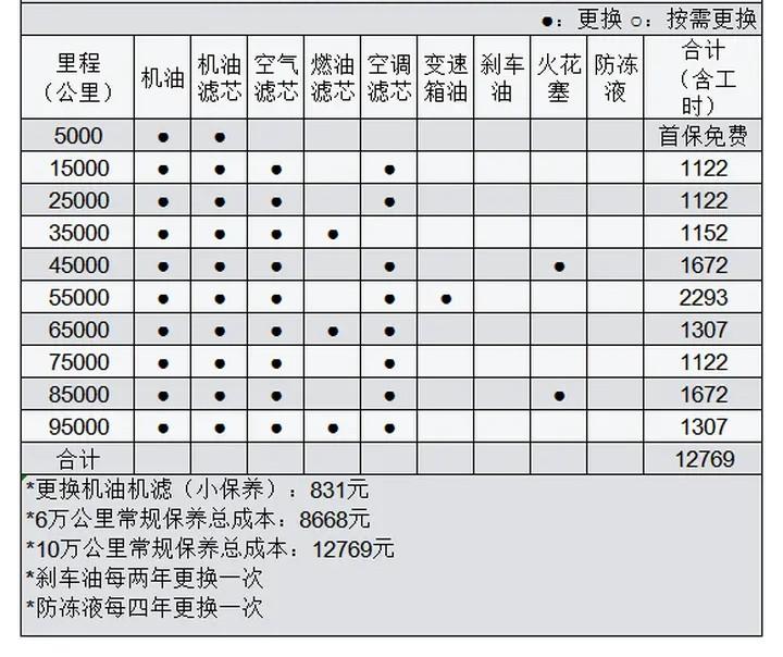 保養方面,根據保養手冊,車輛的首保里程為5000km,建議保養間隔為10000公里或12個月(以先到者為準)。6萬公里內的保養項目及費用大致包括:機油、機油濾清器、空氣濾清器、空調濾清器、燃油濾清器、剎車油、火花塞及一些常規檢查,預計費用約為8668元,平均每年約1444元。對于一臺緊湊型SUV來說,這樣的保養費用表現可觀。