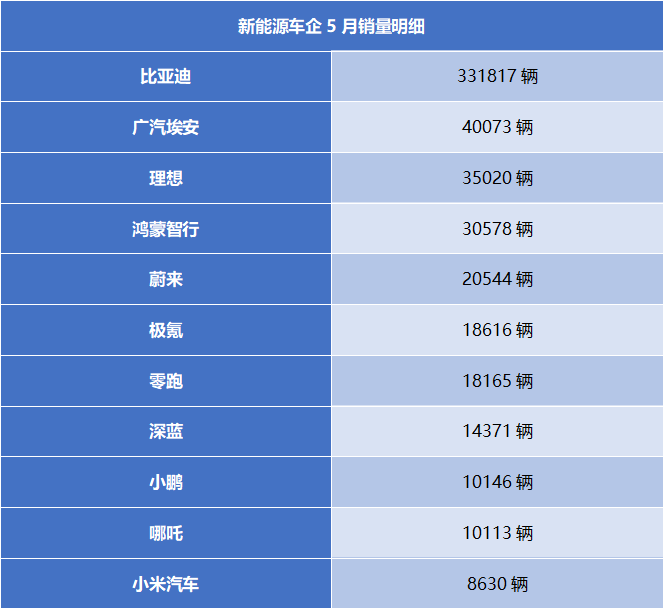 剛踏入6月,各家新能源車企就陸續公布了5月銷量數據,幾乎所有車企都實現了環比增長,極氪、零跑、蔚來等多家車企5月銷量創新高。比亞迪5月銷售331817輛,強勢領跑國內新能源市場,其中,王朝和海洋系列共計銷售31.5萬輛,同比增長38.2%。廣汽埃安5月銷量重回4萬+,環比增長42.5%。理想5月交付新車35020輛,其中,理想L6累計交付突破1.5萬輛。詳情如下:
