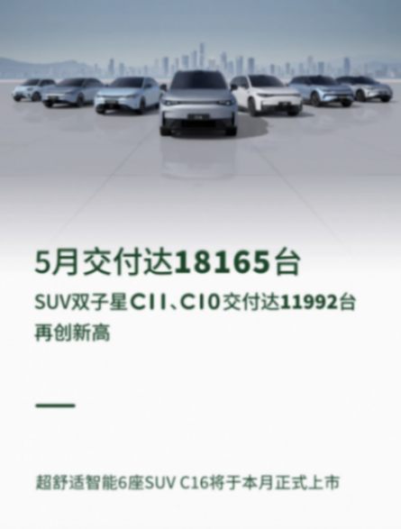 零跑5月交付新車18165輛,同比增長50.6%,環比增長21.1%,其中零跑C11和零跑C10合計交付11992輛。除受春節假期影響的2月之外,零跑其他月份的銷量都保持在1萬輛以上。新車方面,零跑C16將于6月上市,新車此前已開啟預訂,頂配價格將不超過20萬。