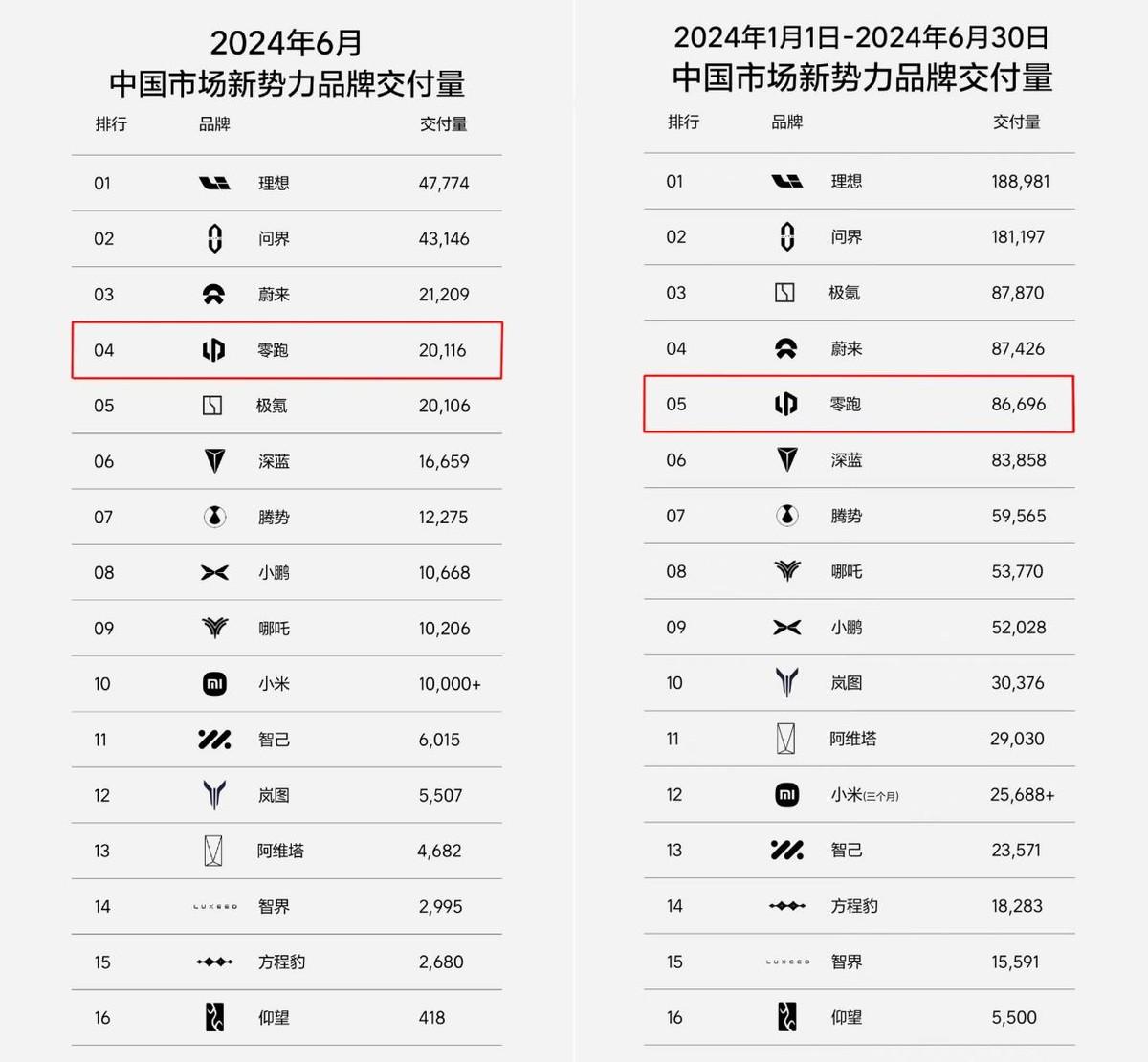 從2024年6月中國市場(chǎng)新勢(shì)力品牌交付量來看,月銷超2萬輛的只有五家!分別是理想,問界,蔚來,零跑,極氪。這五家公司目前是新勢(shì)力第一梯隊(duì)!