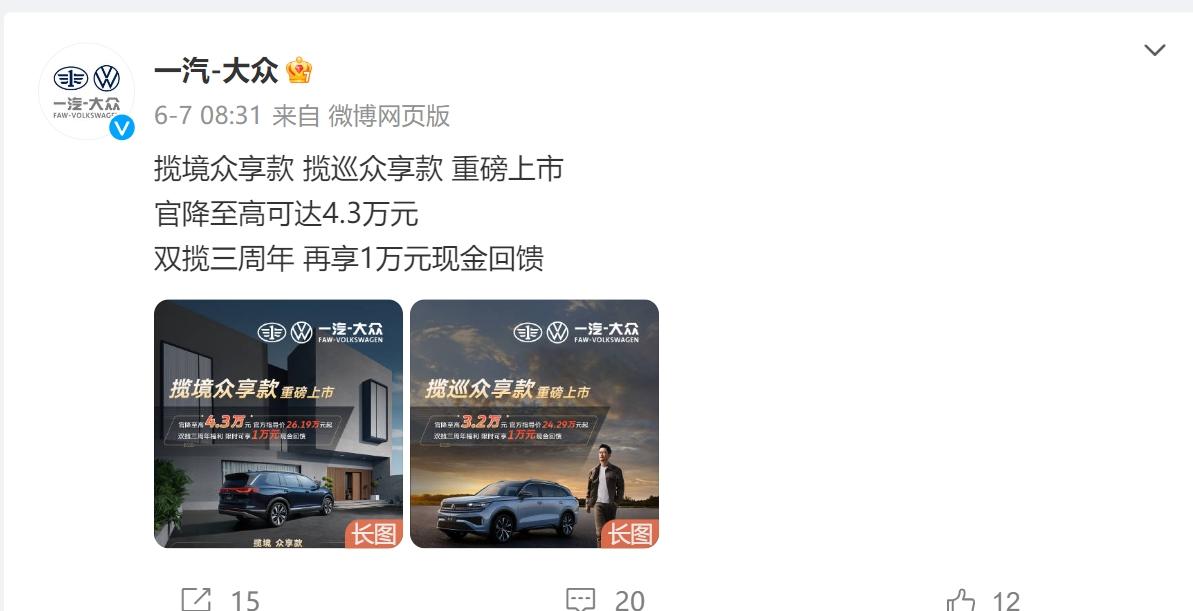 此外,在年中時刻,一汽-大眾也推出優惠促銷,鬼哥在官方微博上看到,一汽-大眾的攬境眾享款和攬巡眾享款上市,官降至高達到4.3萬元,與此同時,一汽-大眾還推出各種用戶權益,以及限時現金回饋,優惠力度很大。