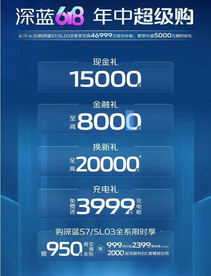 當然,國產品牌也是來勢洶洶。深藍推出“618年中超級購”,活動時間是6月17日-6月30日,這次參與活動車型包括深藍S7/深藍SL03,全系至高優惠達到46999元綜合補貼,還有價值5000元的限時好禮?,F在,新能源市場內卷升級,深藍汽車一邊加推新車,一面推出優惠促銷。