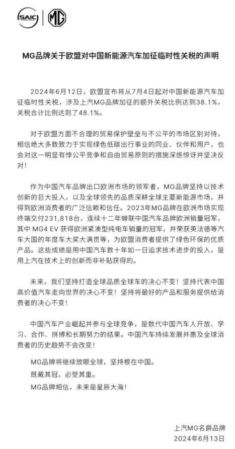 歐盟一意孤行,繼續(xù)發(fā)布加征關稅的政策,也讓中國車企非常失望。上汽MG、吉利汽車紛紛在6月13日發(fā)布聲明。