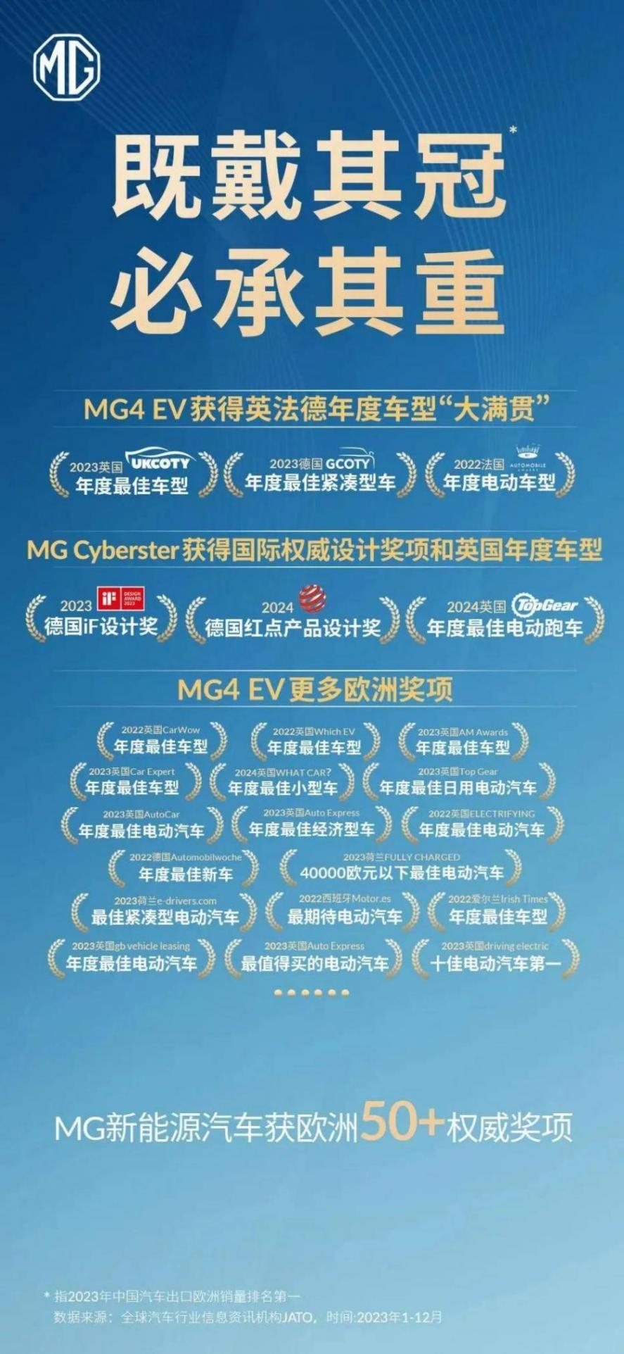其中,MG品牌的“全球車”M4 EV不僅銷量領先,還拿獎拿到手軟,2023年,該車型是首款斬獲英法德年度車大獎大滿貫的中國車型,獲得“歐洲緊湊型純電車銷量冠軍”與“中國新能源車型出口冠軍”。