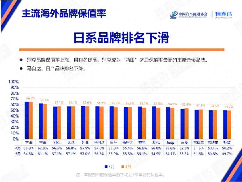 鬼斗車觀點:5月份海外主流汽車品牌保值率榜單,日系品牌保值率數據下滑明顯,別克的表現很出色,此外,德系大眾以及起亞品牌的保值率表現很穩定。