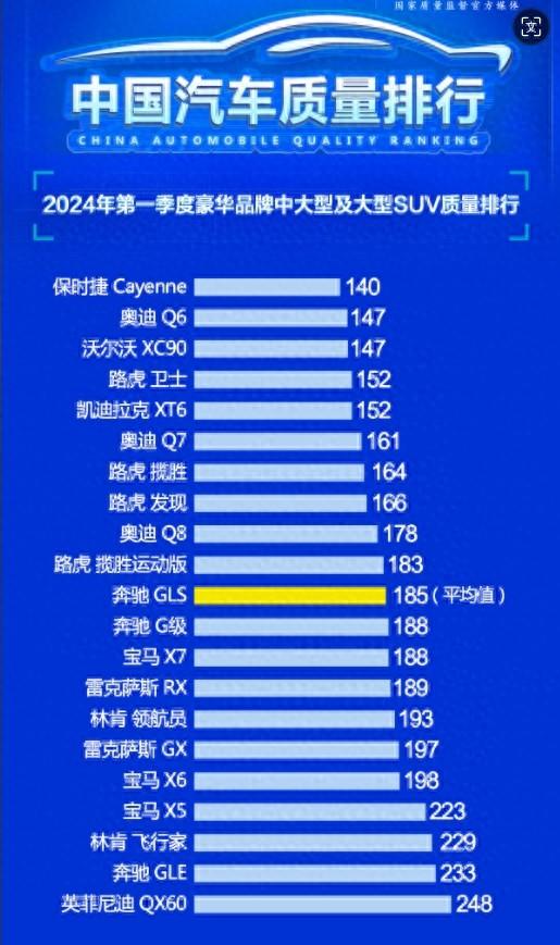 那么,哪些豪華中大型及大型SUV品質過關呢?不妨來看看質量測評榜單。日前,中國汽車質量網發布《2024年第一季度豪華品牌中大型及大型SUV質量排行》,這份榜單上,共有21款車型參與測評,質量測評的平均分達到185分。分數越小代表車型的質量越好,接下來,看看哪些豪華中大型及大型SUV表現得更好?