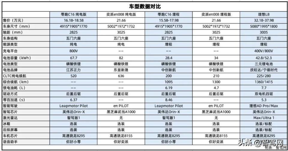 從核心數(shù)據(jù)上對比,零跑C16在車身尺寸、軸距上略遜于eπ008和理想L8,增程版車型,電池容量低于理想L8,但在性價比下,零跑C16是對半式砍價。
