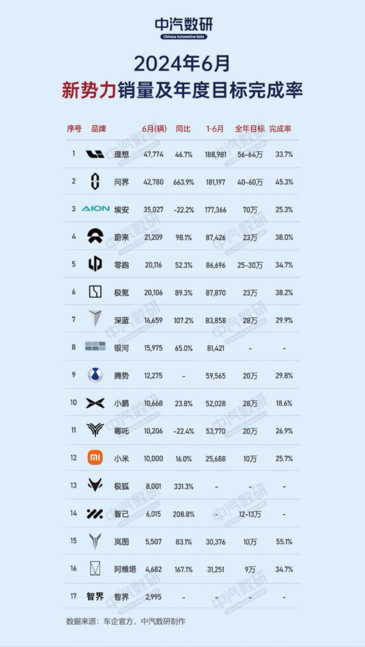不難看出新勢(shì)力的銷量目標(biāo)大多定的不低,但完成度很一般。雖然上半年有過年的影響,但除了問界幾乎沒有超過40%的,就很難看了。現(xiàn)在看來(lái),也就是問界和小米有能力完成銷量目標(biāo),連理想都難。