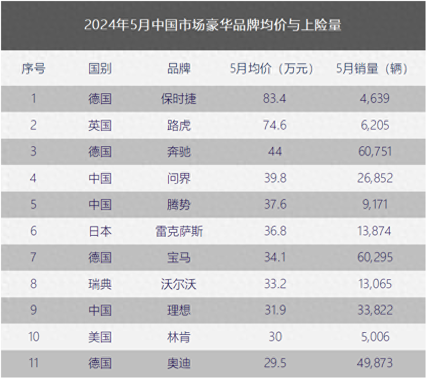 有三個中國品牌入榜,問界排名第四,5月均價近40萬元,大家都知道,這必然是問界M9的作用,單價超45萬元,月銷還能破萬,確實厲害。騰勢第五,5月均價37.6萬元,雖然目前騰勢旗下有四款車型在售,但主要還是靠騰勢D9這款MPV,騰勢N7改款上市后銷量不高,20萬元區間的純電市場競爭還是比較激烈的。理想排名第九,5月均價31.9萬元,銷量比問界高不少,不過隨著L6的交付,估計均價會下來不少。
