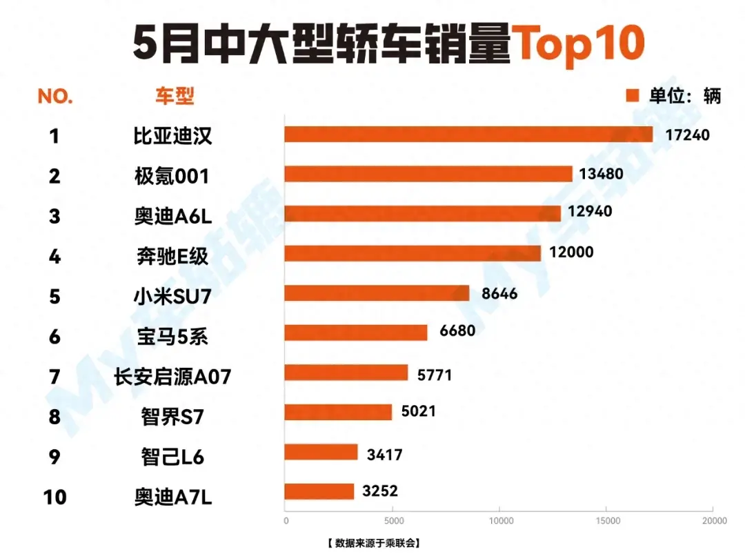 5月最新銷量數據出爐,中大型轎車市場的戰況有些出乎意料。奔馳、寶馬、奧迪的排次正在降低,傳統豪華品牌的影響力被削弱,取而代之的是智能化程度較高的自主品牌車型成為了熱門之選,比如小米SU7這樣的后起之秀。