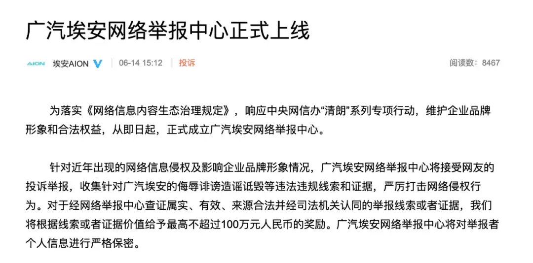 近日,網(wǎng)絡(luò)上有消息稱“廣汽埃安將裁員20%”、“廣汽埃安密集與應(yīng)屆生解約”。針對(duì)以上不實(shí)信息,廣汽埃安反應(yīng)迅速,不但采取報(bào)案措施,而且還成立了廣汽埃安網(wǎng)絡(luò)舉報(bào)中心。種種措施表明,廣汽埃安要加大力度粉碎謠言,以正視聽(tīng)。