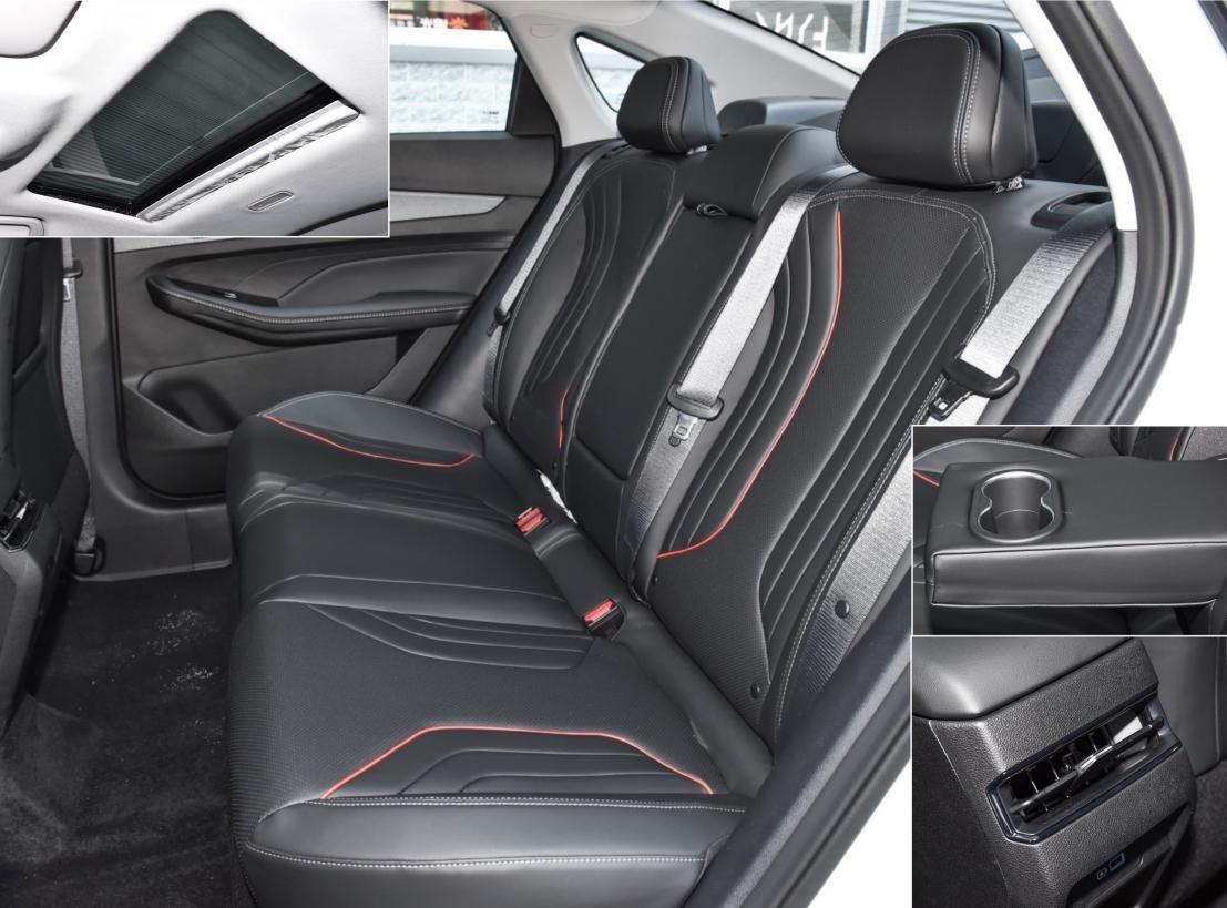 后排座椅材質相同,也有橙色裝飾,靠背有合適的傾斜度和一定的側向支撐,坐墊長度夠用??臻g方面,侃弟身高175cm,腿部空間一拳半,頭頂三指略多,橫向基本可乘坐三人,地板平整度較高。配置方面,有天窗、后排出風口和帶雙杯架的可翻折扶手。