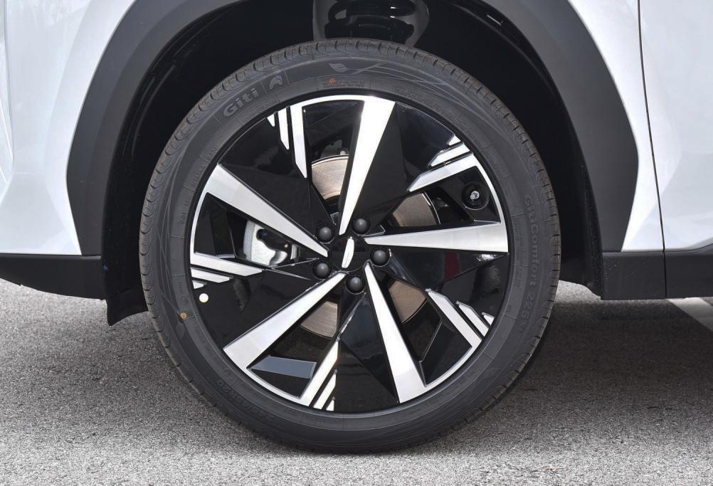 提供18、19和20英寸三種輪圈,這臺車是19英寸,五輻雙色造型如刀鋒般銳利。輪胎規格為235/50 R19,匹配佳通Comfort 225V1系列產品,有不錯的減阻和靜音效果。