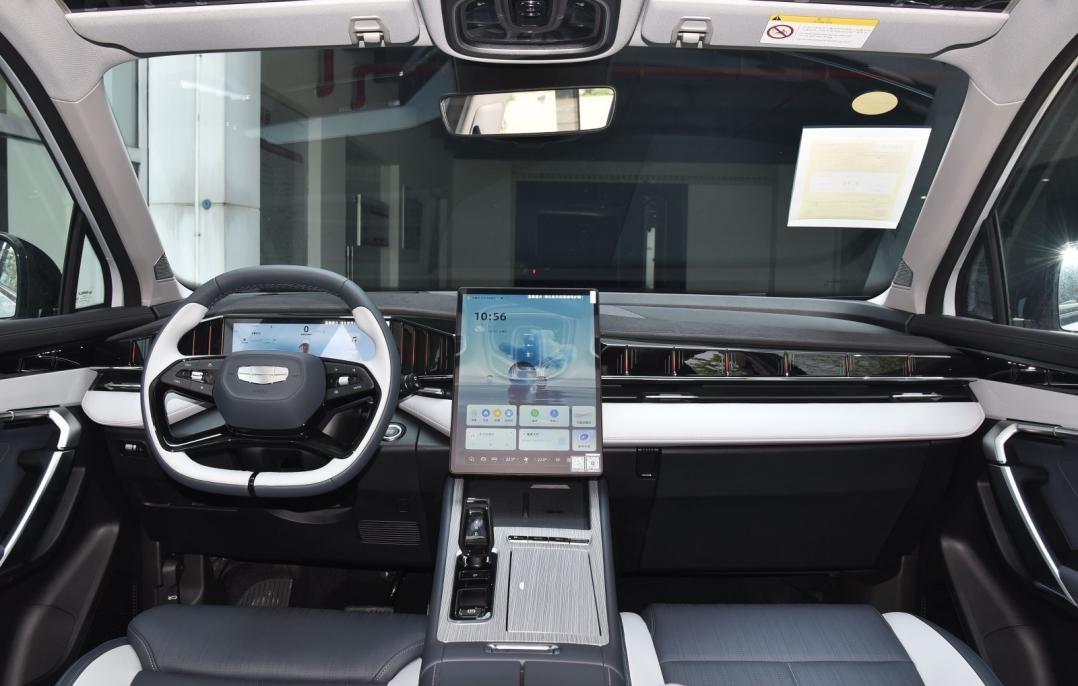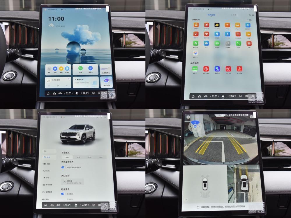 13.2英寸豎置中控屏是標配,分辨率達到2K,由高通8155芯片帶動,流暢度較高。最新的銀河OS 2.0系統采用了干凈的桌面風格和底部卡片入口,功能豐富,車控主菜單豎列于左側,有直觀的畫面展示,十分順手。新的語音系統支持四音區識別,連續對話和可見即可說,體驗也不輸新勢力。帶透明底盤功能的540度全景影像畫質清晰。