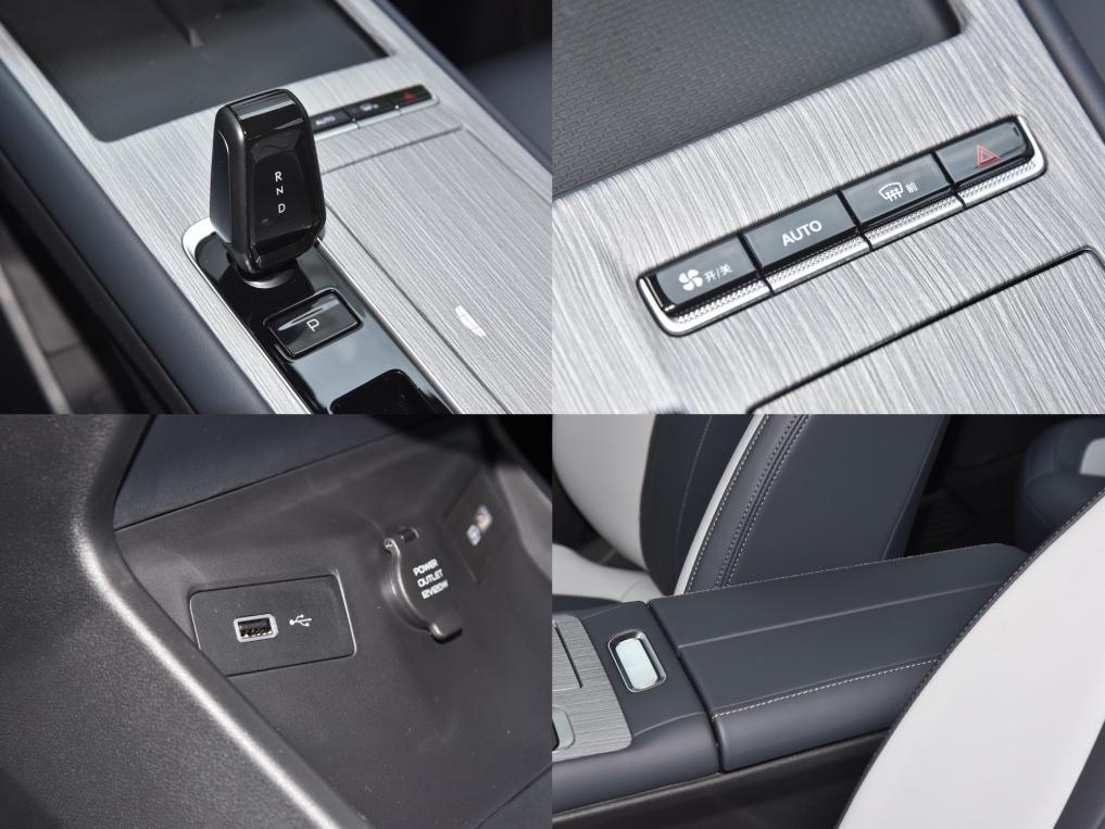 新車的一個升級點是更換了小尺寸電子擋位,占用空間更小。仿木紋的臺面上僅保留了少量常用或重要實體按鍵,比較整潔。前方雙手機位帶無線充電模塊,后方滑蓋下方有雙水杯架。下層雙通道儲物空間高度充裕,內置雙USB接口和12V電源。