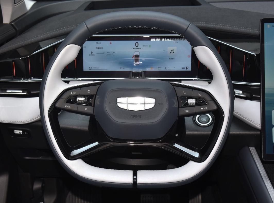 四輻式多功能方向盤采用上下平底造型,雙色搭配有高級感,仿皮材質觸感舒適,尺寸也比較合適??刂茀^采用按鍵與滾輪組合,比較順手。中高配車型都有L2級駕駛輔助系統,其中頂配智駕版新增了高速NOA領航駕駛,在高速、高架路段可實現自動變道超車、自動下匝道等功能,還有自動泊車入位和遙控泊車,達到當前新勢力的主流水平。