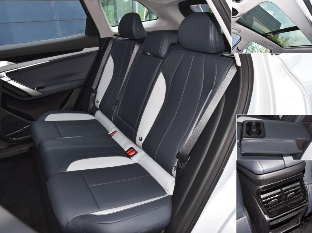 后排座椅材質與前排相同,填充物同樣厚實,坐墊長度足夠,靠背有少量側向支撐,舒適性也不錯。空間方面,侃弟身高175cm,腿部三拳略多,頭頂一拳半,橫向充裕,地板全平,乘坐三人也比較舒適。提供地臺式出風口、USB接口、帶雙水杯架的可翻折扶手,車頂有大尺寸全景天窗,帶電動遮陽簾。