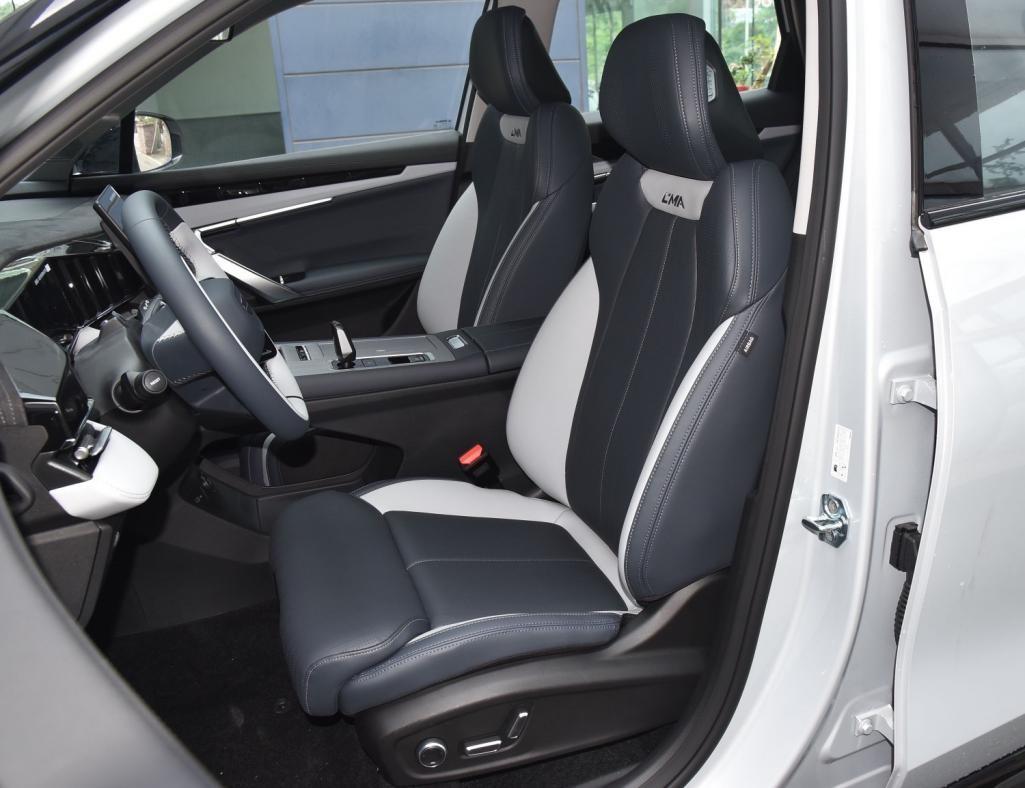 座椅標配仿皮材質,雙色搭配并增加縫線,顯得精致。高配車型主駕頭枕融集成音響單元,還提供手動腿托,體驗比較超前。座椅填充物飽滿,靠背和頭枕都有良好的側向支撐,舒適性較高。主駕座椅在6向調節的基礎上,增加了4向腰撐調節,還提供加熱、通風和按摩,副駕駛同樣有加熱通風和腿托,前排座椅都有記憶功能。