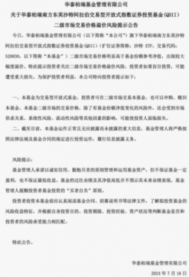 對此,華泰柏瑞基金在下午的交易時間發布公告稱:今日,公司旗下華泰柏瑞南方東英沙特阿拉伯交易型開放式指數證券投資基金(QDII)二級市場交易價格明顯高于基金份額參考凈值,出現較大幅度溢價。特此提示投資者關注二級市場交易價格溢價風險,投資者如果盲目投資,可能遭受重大損失。