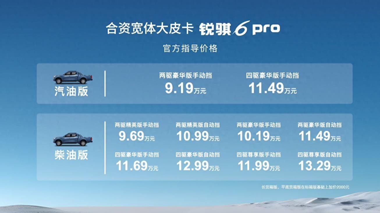 9月20日,鄭州日產(chǎn)銳騏6 Pro正式上市,售價9.19-13.29萬元。新車提供汽油/柴油、手動/自動、兩驅(qū)/四驅(qū)、標箱/長箱/平箱等35種款型選擇。其中,汽油版車型售價區(qū)間為9.19-11.49萬元,柴油版車型售價區(qū)間為9.69-13.29萬元。