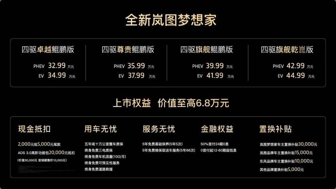 其中,全新嵐圖夢想家四驅卓越鯤鵬版PHEV 32.99萬元、EV 34.99萬元;全新嵐圖夢想家四驅尊貴鯤鵬版PHEV 35.99萬元、EV 37.99萬元;全新嵐圖夢想家四驅旗艦鯤鵬版PHEV 39.99萬元、EV 41.99萬元;全新嵐圖夢想家四驅旗艦乾崑版PHEV 42.99萬元、EV 44.99萬元。同時,截至10月10日,嵐圖還為用戶提供至高6.8萬元的首銷期專享權益,包含2千元抵5千元現金抵扣,原價3萬首銷期僅需1萬元的ADS3.0高階智駕包;此外還有用車無憂、服務無憂、0息金融等權益;針對換購的用戶還有至高3萬元的置換補貼。