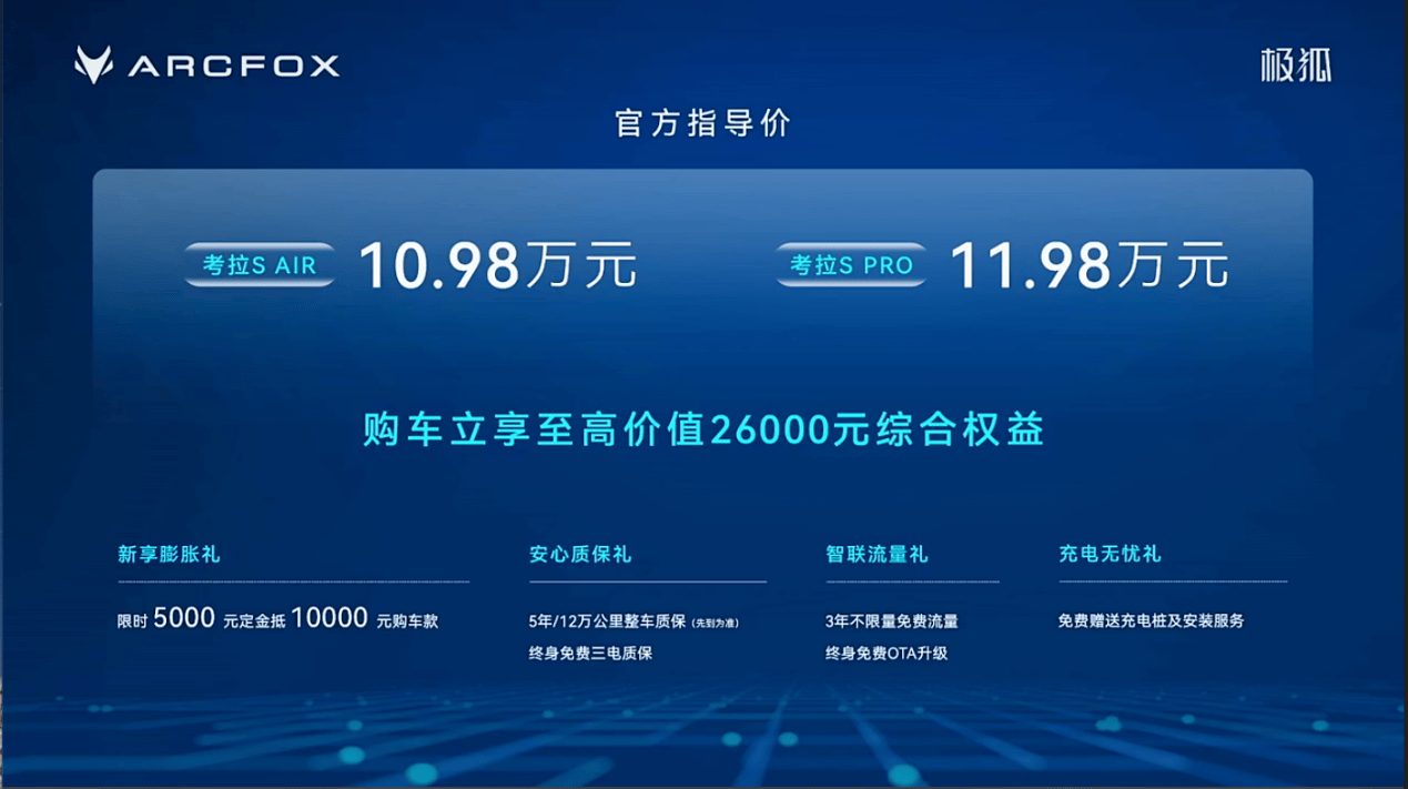 同時,針對考拉S這款大五座純電SUV,北汽極狐還推出了限時5000元定金抵10000元購車款權益,同時用戶還將享受5年/12萬公里整車質保、終身免費三電質保、3年不限量免費流量、終身免費OTA升級和免費贈送充電樁及安裝服務等,誠意滿滿。
