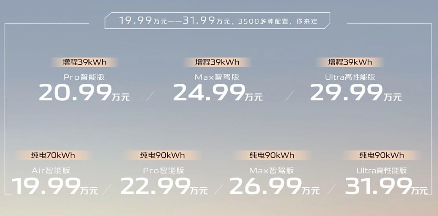 從動力上看,增程版有兩種動力選擇,純電版有三種動力選擇: