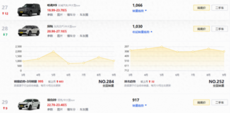 日產(chǎn)探陸深耕海外市場,今年引入國內(nèi)市場,企圖在競爭激烈的汽車市場中分“一杯羹”。如今懂行的消費者越來越多,日產(chǎn)探陸要想獲得成功,必須有足夠出色的產(chǎn)品力,才能吸引消費者。根據(jù)官方給出的汽車銷量排行榜來看,日產(chǎn)探陸的銷量忽高忽低,今年9月份交付1030臺新車,甚至比8月份還要下滑。
