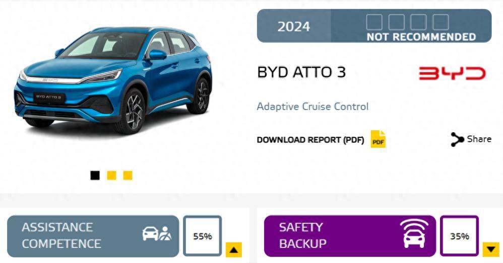 至于早前在2022年Euro NCAP碰撞測試上獲得五星安全評級的比亞迪Atto 3則在這次的駕駛輔助系統評測中被評為 “不推薦”。Euro NCAP指比亞迪Atto 3的自適應巡航表現欠佳,在遇到障礙物時無法有效剎車,并且在長時間沒有操作后,關閉轉向支持,但依舊保持速度控制,令駕駛員無法即時做出反應。