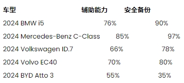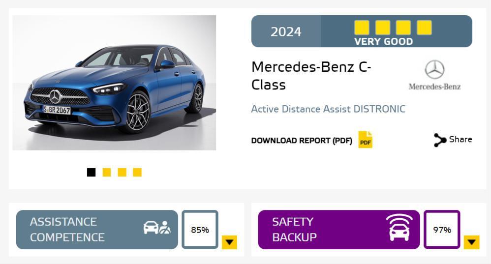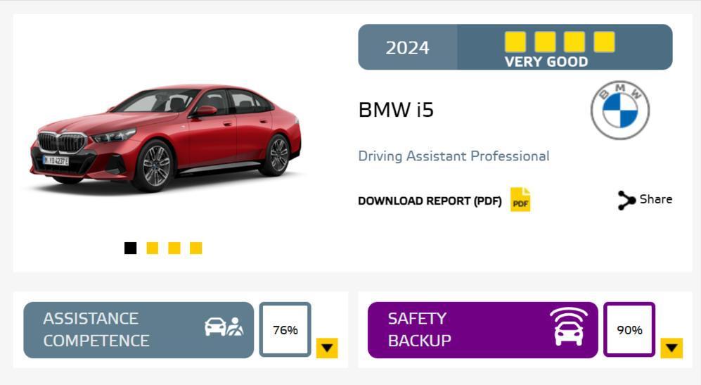 測試中,寶馬i5和梅賽德斯奔馳C-Class皆拿下“非常好”(Very Good)評級。Euro NCAP指出,兩款車子的系統提供了穩定的速度和控制,能減少駕駛員的負擔,但不會有過多的干涉輔助,駕駛員可隨時重新掌控。