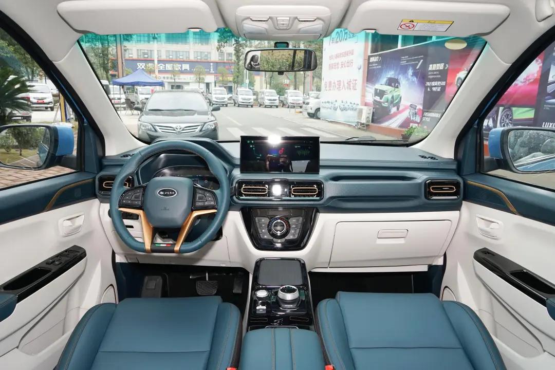 接下來,咱們再看看車內。斯威大虎EDi的內飾采用了撞色設計,上藍下淺的配色搭配金色元素,視覺效果還算不錯。不過,由于成本控制,內飾材料多為塑料,整體質感可能不如一些高端品牌。但話說回來,作為一款家用SUV,這種設計其實是可以理解的。