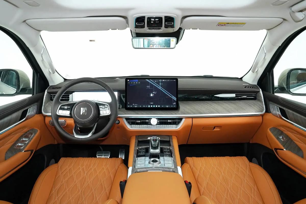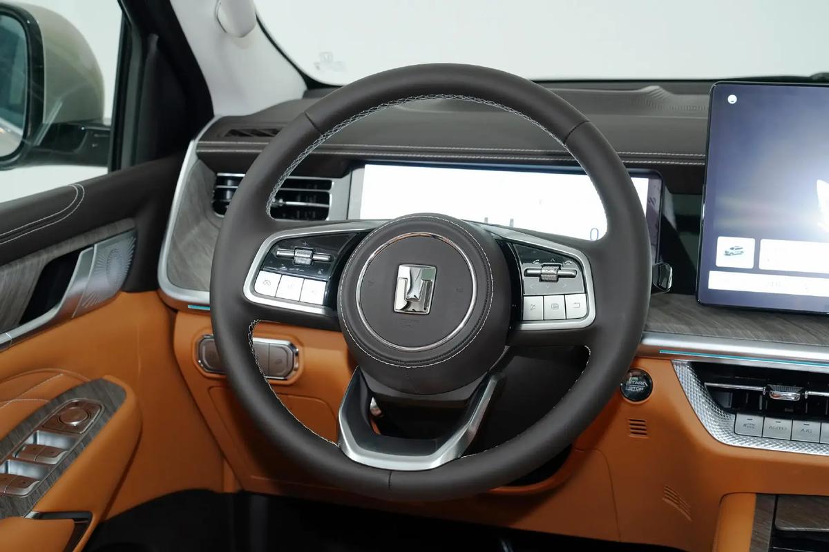進入到駕駛艙,坦克500 Hi4-Z與現款也是基本一致,僅僅在細節裝飾與圖案方面有一些調整。從中控出風口中間的鐘表與換擋機構中大量金屬按鍵,我們就能立馬感受到這臺車的“傳統”。不過,更清爽的內部裝飾與色彩搭配方案又稍稍降低了它的年紀感。而且無論是帶烤漆的三輻式方向盤,還是采用立體分層且帶有木紋飾板的中控臺,甚至是波浪絎縫紋理的全真皮座椅,這些高級材料與設計一用上,管它風格傳不傳統,反正座艙的豪華感是立馬就有了。