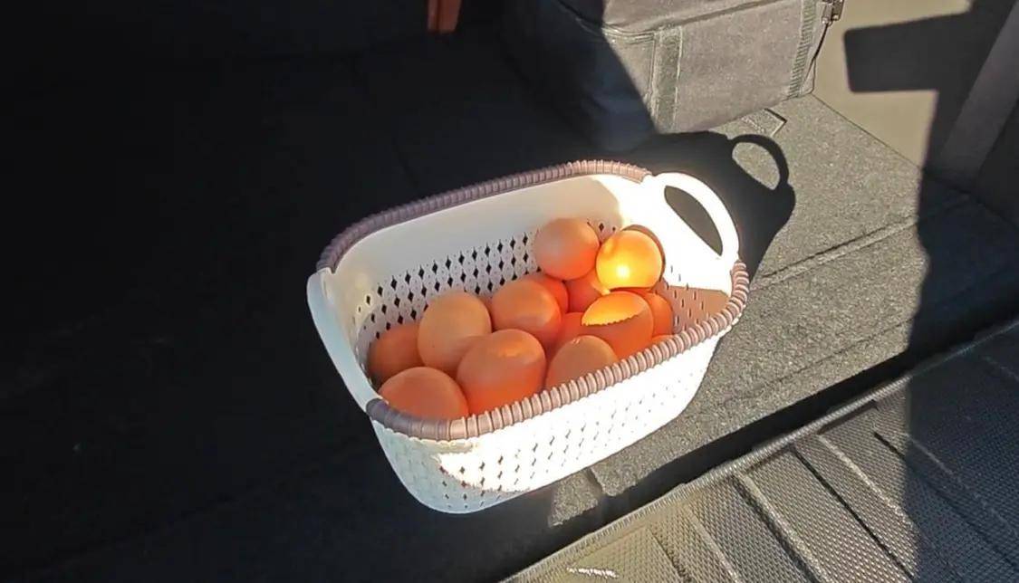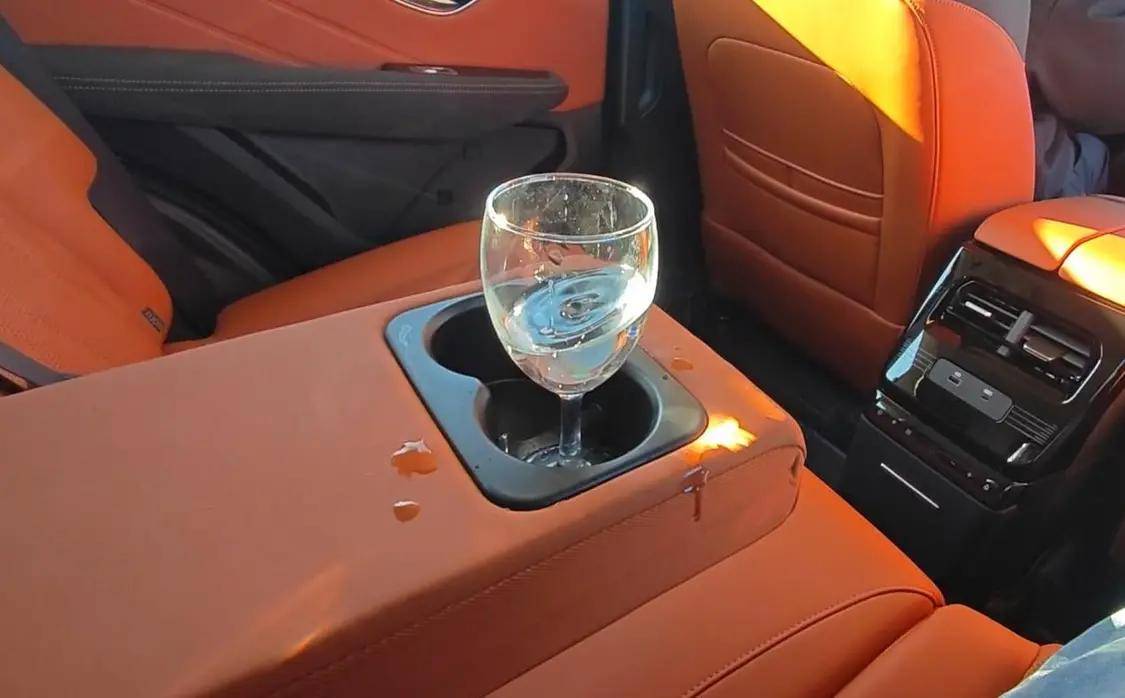 下一項測試就是底盤的測試了,這項測試更簡單粗暴,后排杯架上設置一杯水,后備箱放上一筐雞蛋,通過連續的減速帶,水灑得少、雞蛋不破裂即為成功。