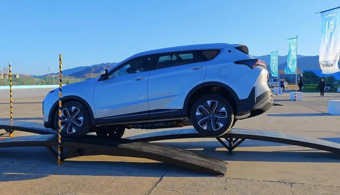 接下來就是交叉軸測試了,其實這個測試并不是檢測車輛的四驅系統,因為山海L7是一款前驅車型,并不是四驅車型,這個測試主要是為了驗證車輛的車身剛性。所以我們將車輛停在交叉軸架的中間位置,讓車輛呈現“翹腳”的姿態,讓車身承受較大的扭轉力。