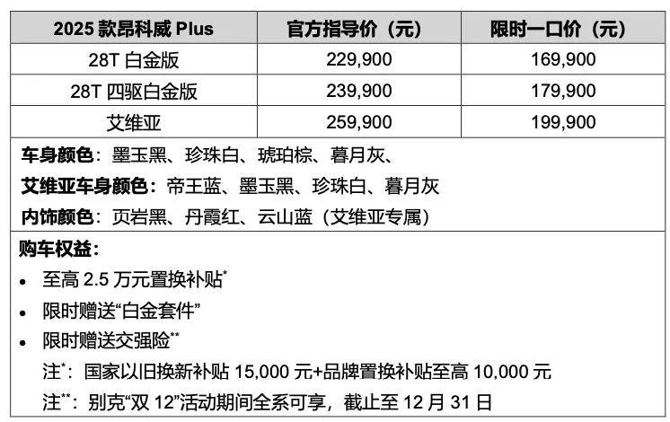 在11月份的時(shí)候,昂科威Plus推出了限時(shí)一口價(jià)政策。雖然說是限時(shí)政策,但到了12月,2025款昂科威Plus正式上市,依舊推出限時(shí)一口價(jià)16.99萬起,限時(shí)一口價(jià)區(qū)間為16.99-19.99萬元,并且還贈(zèng)送交強(qiáng)險(xiǎn),相當(dāng)于又省了1000元左右。