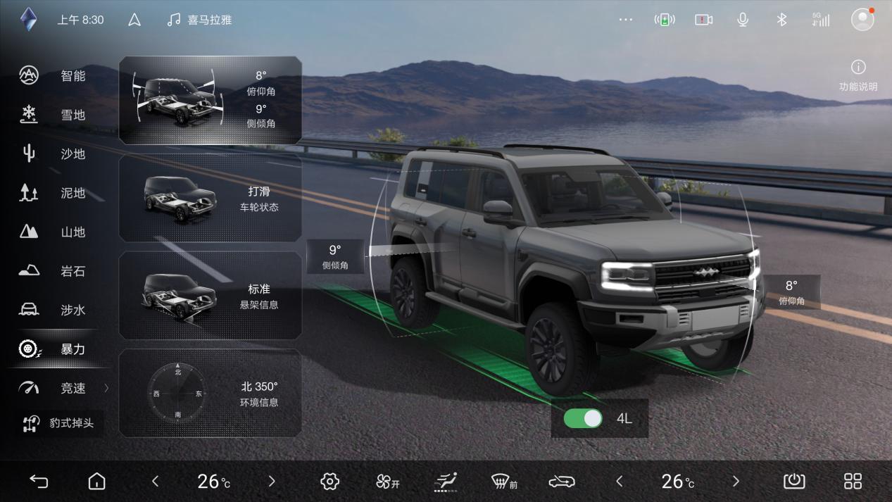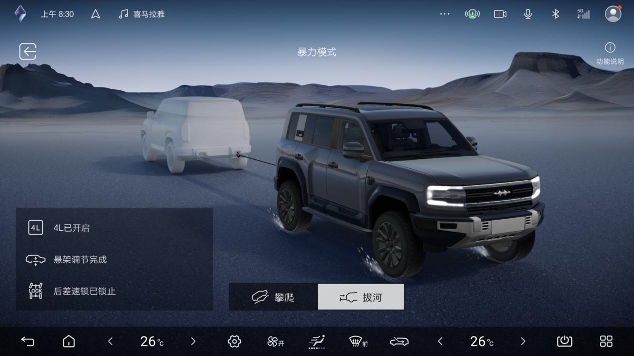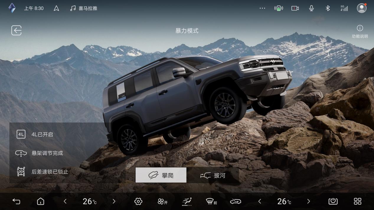 而在戶外場景下,暴力模式也讓豹5變得更加硬核強(qiáng)悍,適用于任意高、中、低附的路面和極限場景。其中暴力模式新增【攀爬】【拔河】兩項功能可選,攀爬場景更能帶來卓越的低速穩(wěn)定性,可以在交叉軸、陡坡、巖石坡等工況下攀爬或自身脫困;拔河場景則能夠提供超強(qiáng)的牽引力,適用于在戶外救援受困車,也可以在拔河競技等牽引工況下進(jìn)行選用。