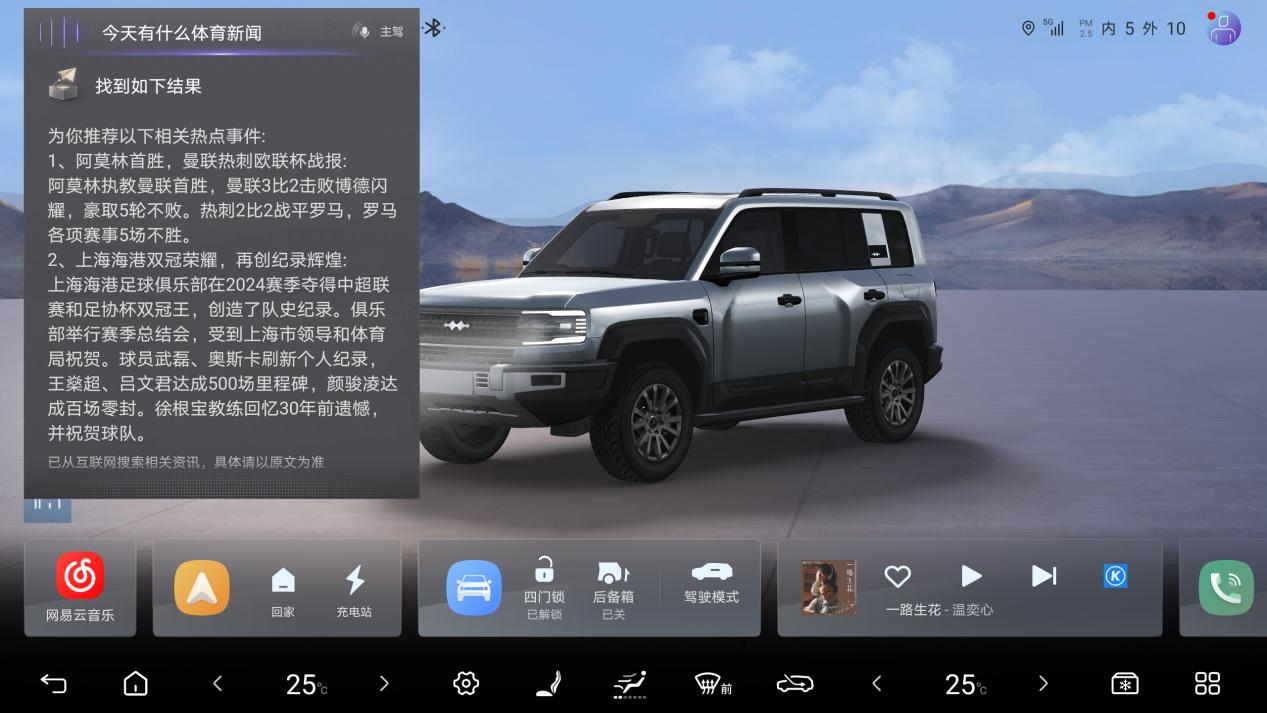 豹5本次OTA升級,重點(diǎn)升級了豹8同款的智能語音功能,將原本需要手動點(diǎn)擊屏幕完成的動作用語音指令代替,讓交互更加智慧、便捷,做到有問必答,開口即懂。其中,新增的全場景智能語音出行攻略功能,可以為用戶查詢酒店、介紹景點(diǎn),并進(jìn)行智慧問答和資訊播報,使出行信息獲取變得更加輕松。