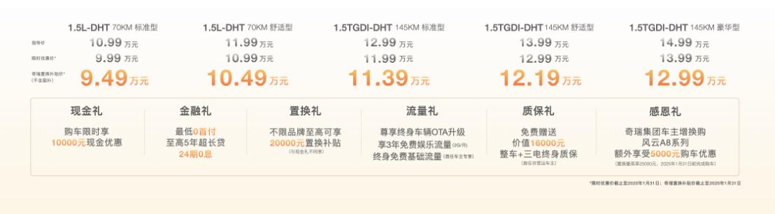 12月17日,奇瑞汽車旗下的風云A8L正式上市,此次新車共推出了5種配置版本,包括:1.5L-DHT 70KM標準型10.99萬元、1.5L-DHT 70KM舒適型11.99萬元、1.5TGDI-DHT 145KM標準型12.99萬元、1.5TGDI-DHT145KM舒適型13.99萬元、1.5TGDI-DHT 145KM豪華型14.99萬元,并帶來購車至高享價值41000元的驚喜6重禮遇,并且算上奇瑞置換補貼價后,最低售價9.49萬元起(不含國補)。